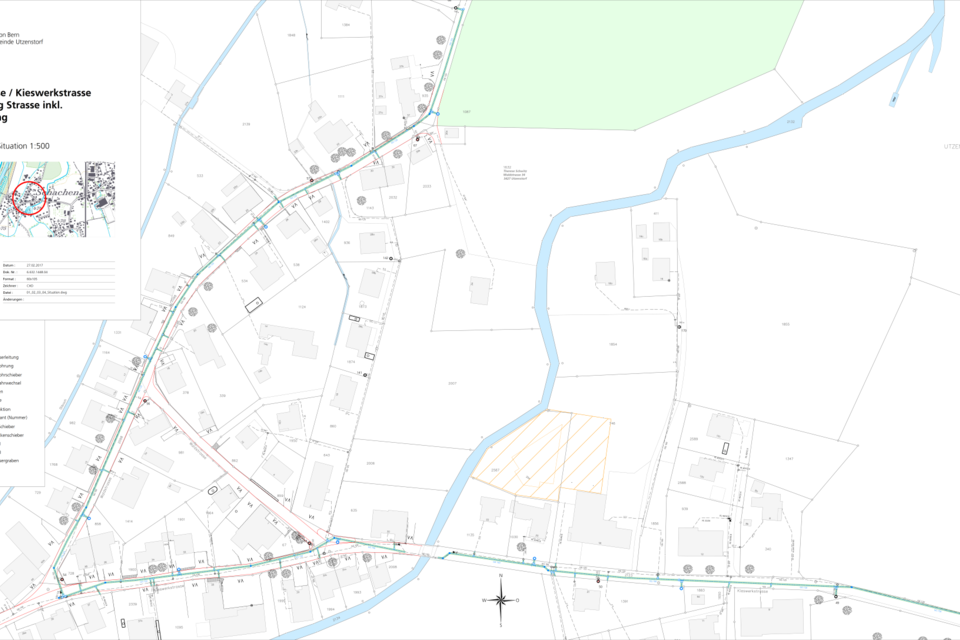 Komplette Erneuerung Strassenkörper. Erneuerung Werkleitungen Abwasser, Wasser, öffentliche Beleuchtung, Elektro, Swisscom. Neubau eines Einstaukanales DN 1820/1500 (Eiprofil) mit Drossel über ca. 190 m